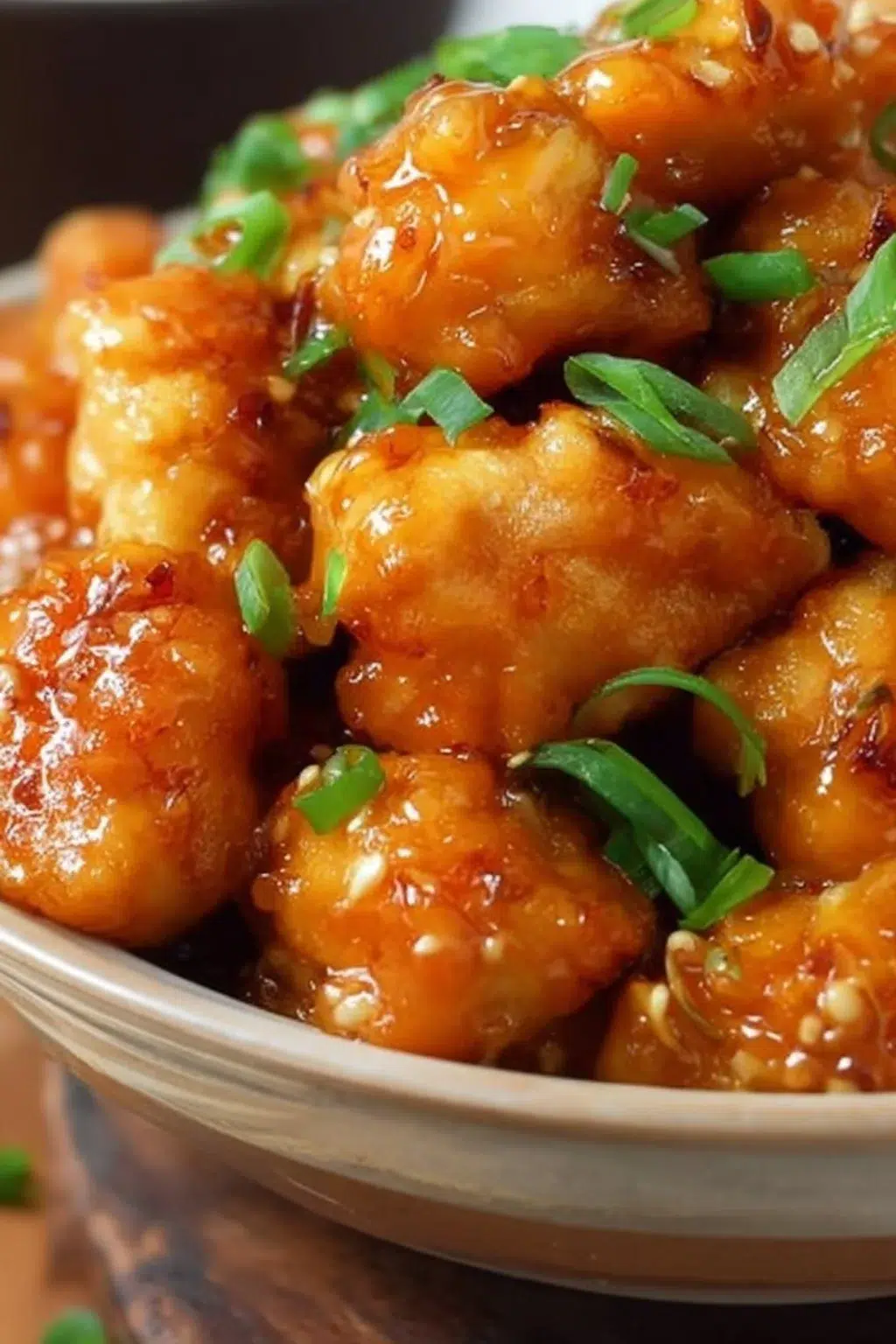 A plate of crispy Chinese orange chicken garnished with sliced green onions
