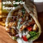 A flavorful Middle Eastern dish with marinated chicken served in pita or flatbread with fresh veggies and sauces.