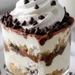 A no-bake dessert featuring a chocolate chip cookie base layered with cream cheese, chocolate pudding, and whipped topping.