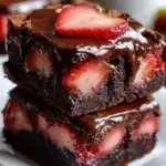 Delicious brownies topped with fresh strawberries and drizzled with melted chocolate, offering a perfect blend of rich and fruity flavors.