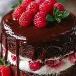You mix the dry things, add the wet things, then bake. You make a simple ganache with cream and chocolate. You stack the cake layers, add ganache and raspberries, then pour ganache to make a drip. For tips on handling soft cake layers, see a quick guide on a chocolate cake roll that uses similar care.