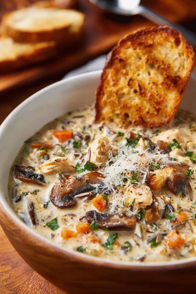 Enjoy your comforting bowl of Creamy Mushroom Chicken and Wild Rice Soup!