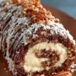 A delightful cake roll featuring a thin chocolate cake with a rich coconut-pecan filling and a creamy frostingโ€”perfect for parties or quiet nights.