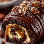 This cake roll looks rich and soft. It has chocolate, caramel, and nuts. It feels warm and gooey. You can make it for a party or a quiet night. Try a similar chocolate cake roll to learn the roll idea.