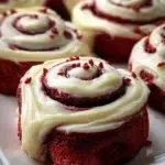 Soft and sweet red velvet cinnamon rolls topped with cream cheese frosting, perfect for brunch or a special occasion.