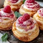 Delightful raspberry cream cheese cruffins featuring soft, flaky layers and a tangy-sweet raspberry filling.