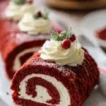 A festive red velvet cake roll filled with creamy whipped cream, perfect for holiday celebrations.