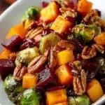 A delightful salad combining roasted butternut squash, Brussels sprouts, crunchy pecans, and tart cranberries, perfect for a healthy meal or festive gatherings.