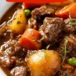 This slow cooker beef stew makes a warm, home meal. It uses beef, carrots, potatoes, onion, and a simple broth mix. You can set the slow cooker and come back to a rich stew. For one more simple version, see slow cooker beef stew guide.