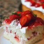 A bright red, sweet poke cake that combines soft vanilla cake with a creamy cheesecake filling and fresh strawberries.