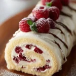 - Spread whipped cream or white chocolate ganache over the roll. Decorate with fresh raspberries, white chocolate curls or shavings, and dust with powdered sugar for a snow-dusted effect.